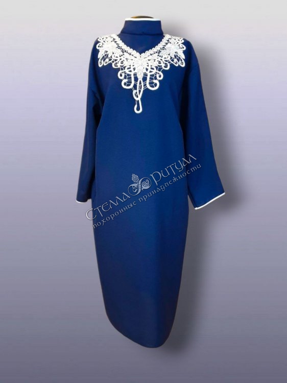 Элегантное женское ритуальное платье с ажурным воротником с жемчужинами.