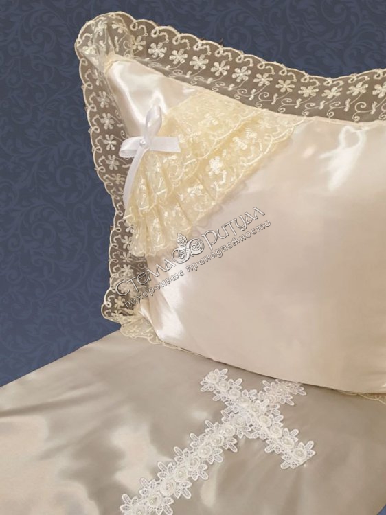 Изысканный ритуальный комплект состоит из покрывала и наволочки.